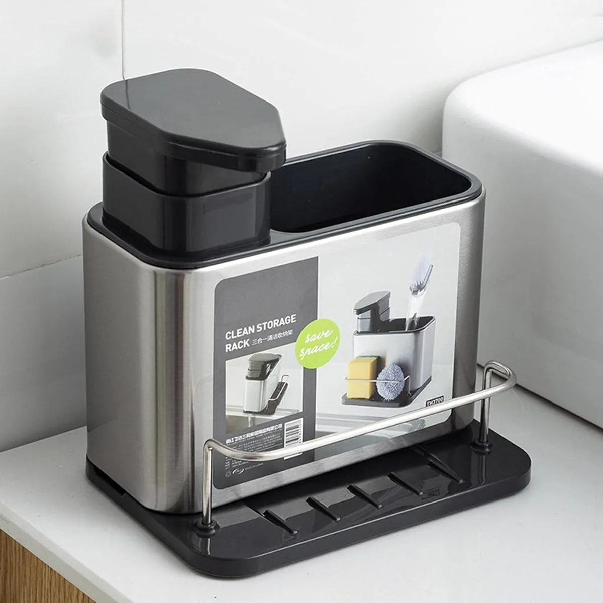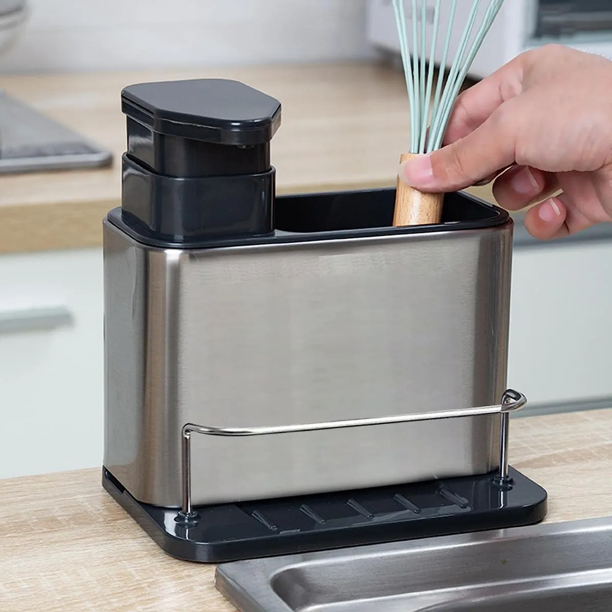 Dispensador de Jabón Integrado para una Mayor Comodidad: Este organizador de fregadero viene equipado con un dispensador de jabón integrado, diseñado para contener una generosa cantidad de jabón para todas tus necesidades de lavado de manos y vajilla.