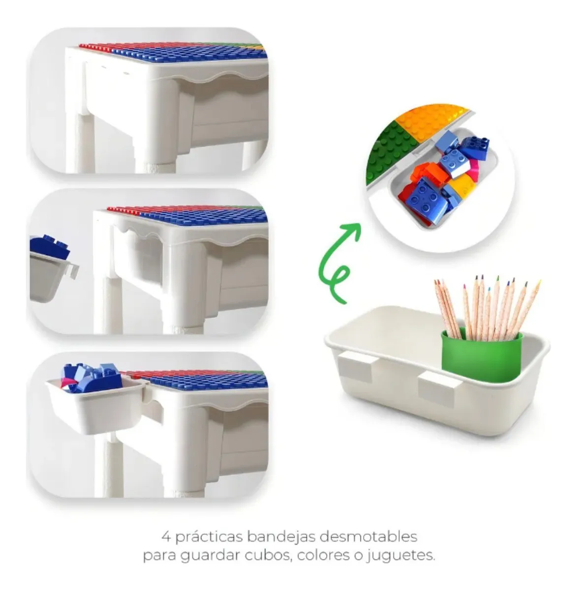 – Superficie de mesa compatible con 86 bloques tipo construcción.