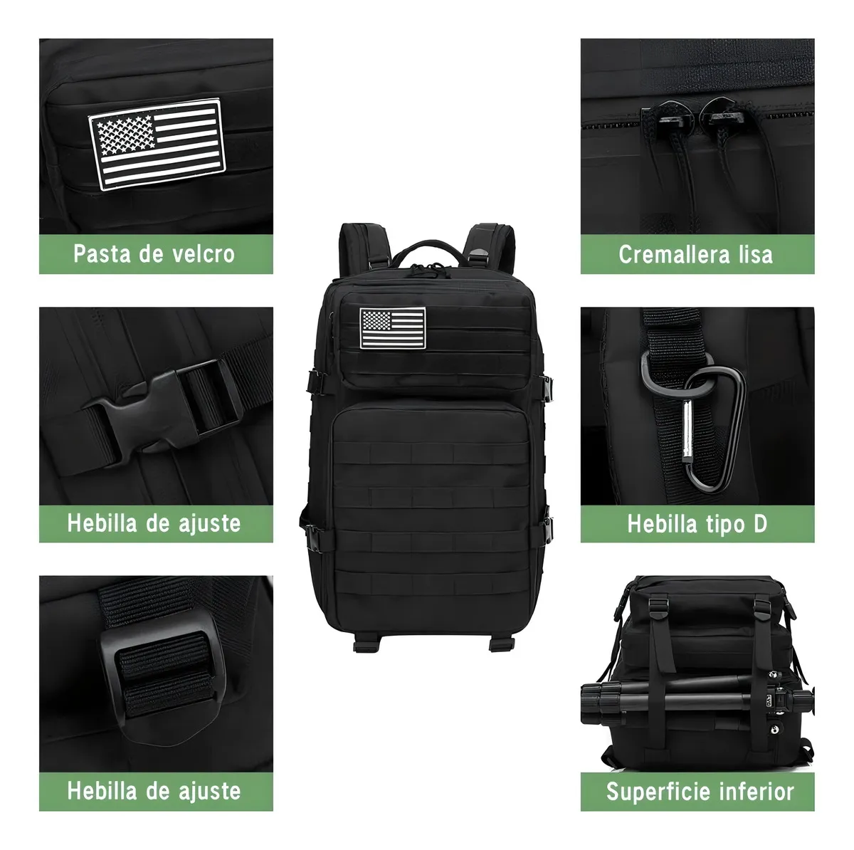Color negro, caqui, verde militar.