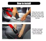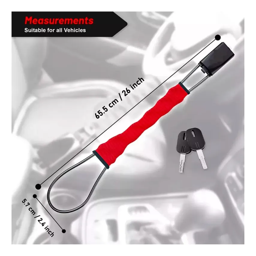 – Las cerraduras antirrobo del cinturón de seguridad son adecuadas para la mayoría de los automóviles. Hasta 17 «de longitud para bloquear el volante y el asiento. Se recomienda ajustar la posición del asiento para un cierre hermético.