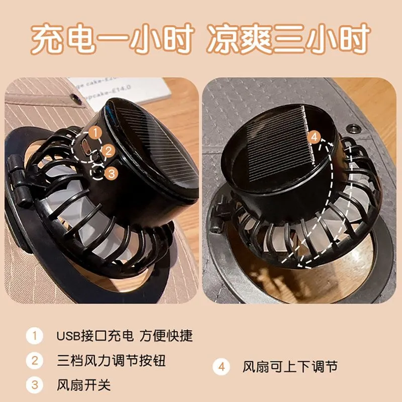 Diseño de ventilador con energía solar + USB, tres velocidades de viento con fuerte duración de la bateria, el ventilador se puede ajustar rotando hacia arriba y hacia abajo.
